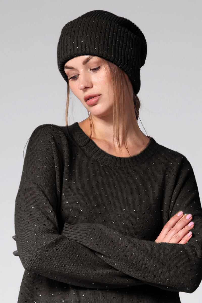 Cotton Cashmere Rhinestone Shaker Beanie Hat in Black