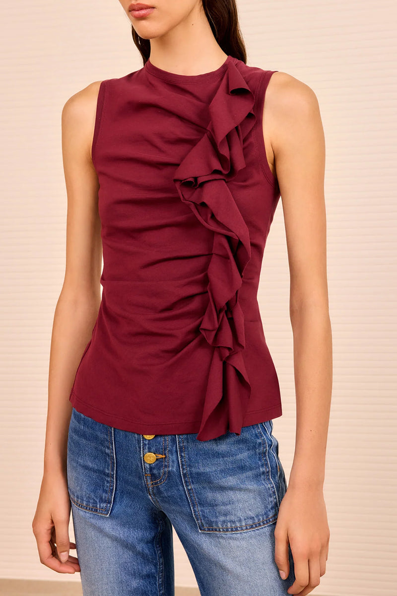 Clio Sleeveless Ruched Ruffle Top in Claret