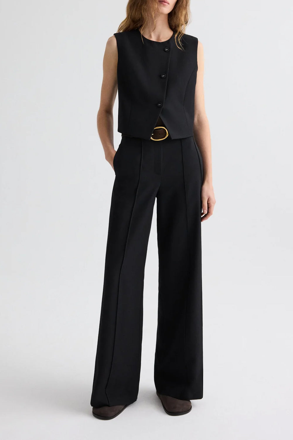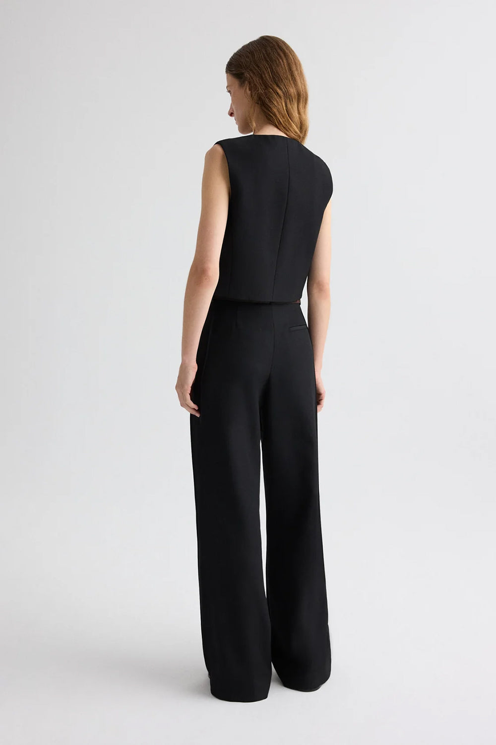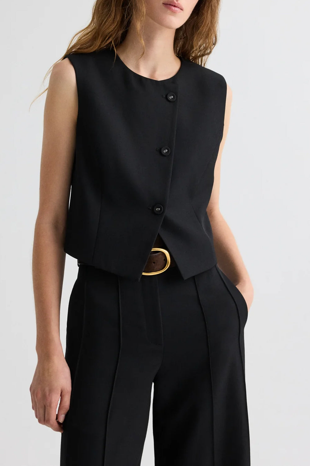 The timeless Perry Vest from TWP is a fresh, modern style crafted from luxe compact tux suiting. This vest features a cropped, structured silhouette with a unique asymmetrical front, welt pockets, and side darts. Style with the coordinating Bond St. Pant or go casual with slouchy jeans. Model is 5’10” wearing size small.