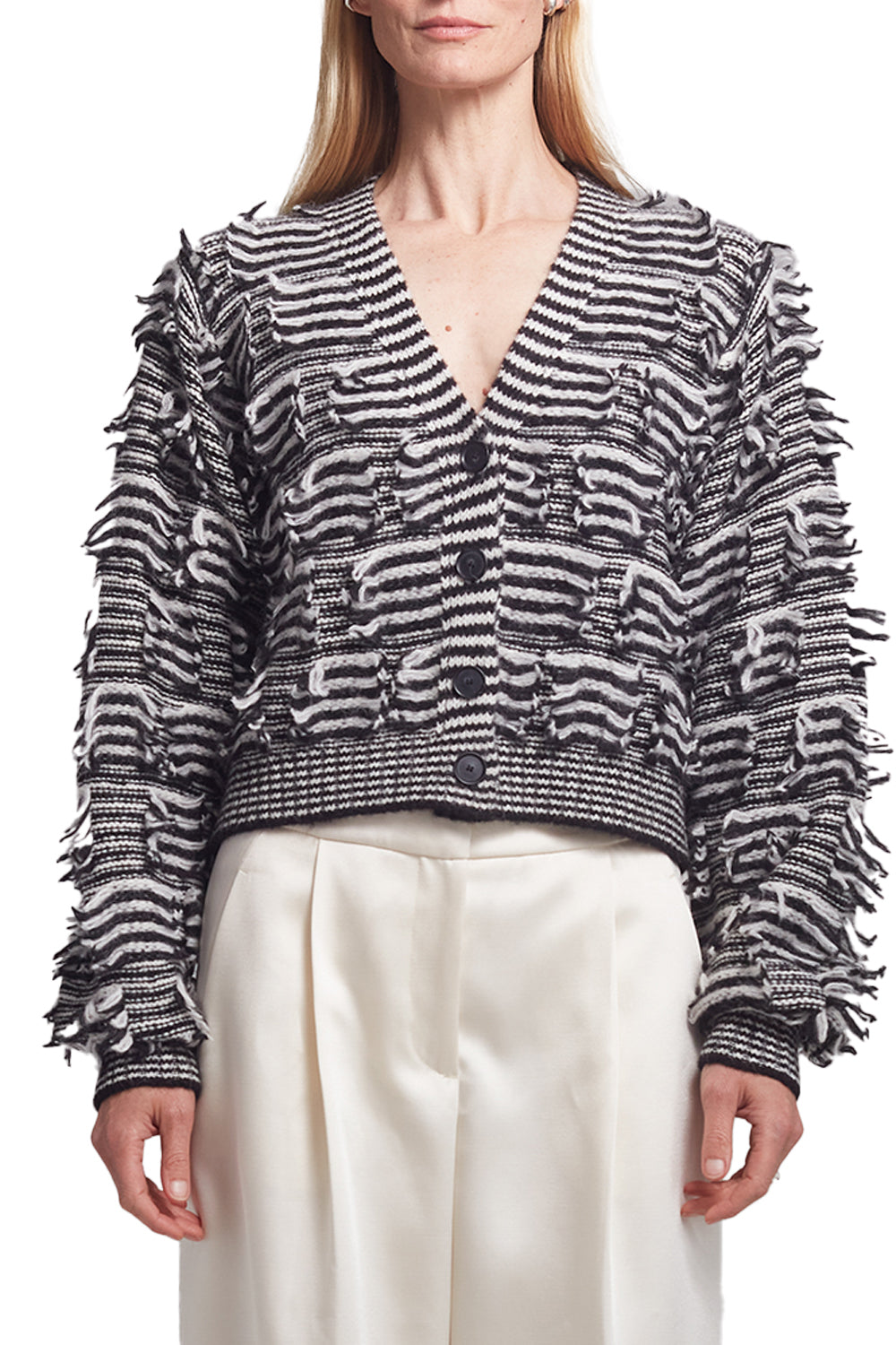 Sustainably crafted in Peru using soft airspun baby alpaca, the Luella Cardi is a beautiful style featuring an over-fringed texture stripe stitch, a slim fit that’s complemented by the generous blouson sleeves, a button front, and ribbed accents. Style with a black leather skirt and tall boots this season. Model is size S, size 2 and 5ft 9” in height.