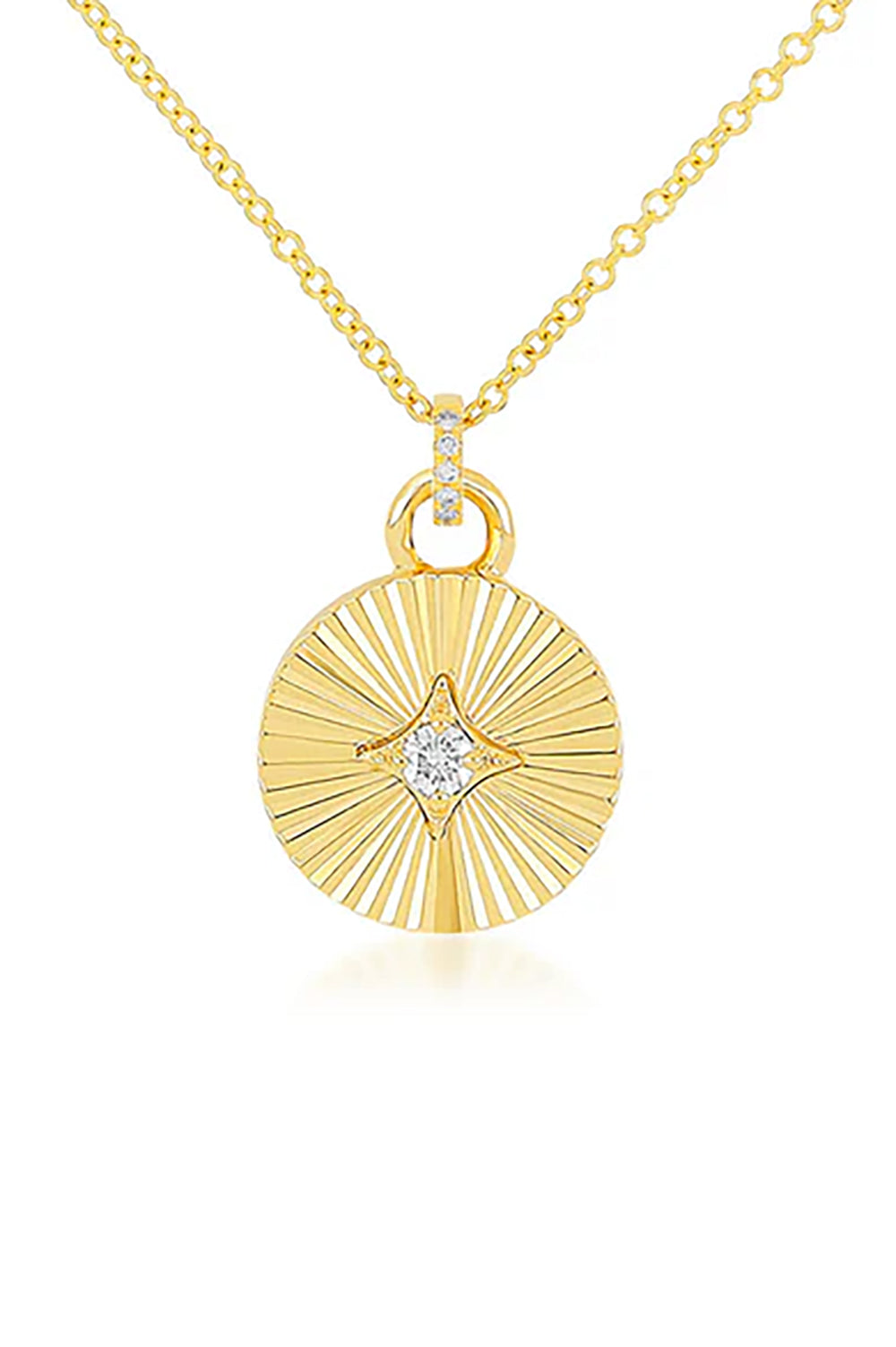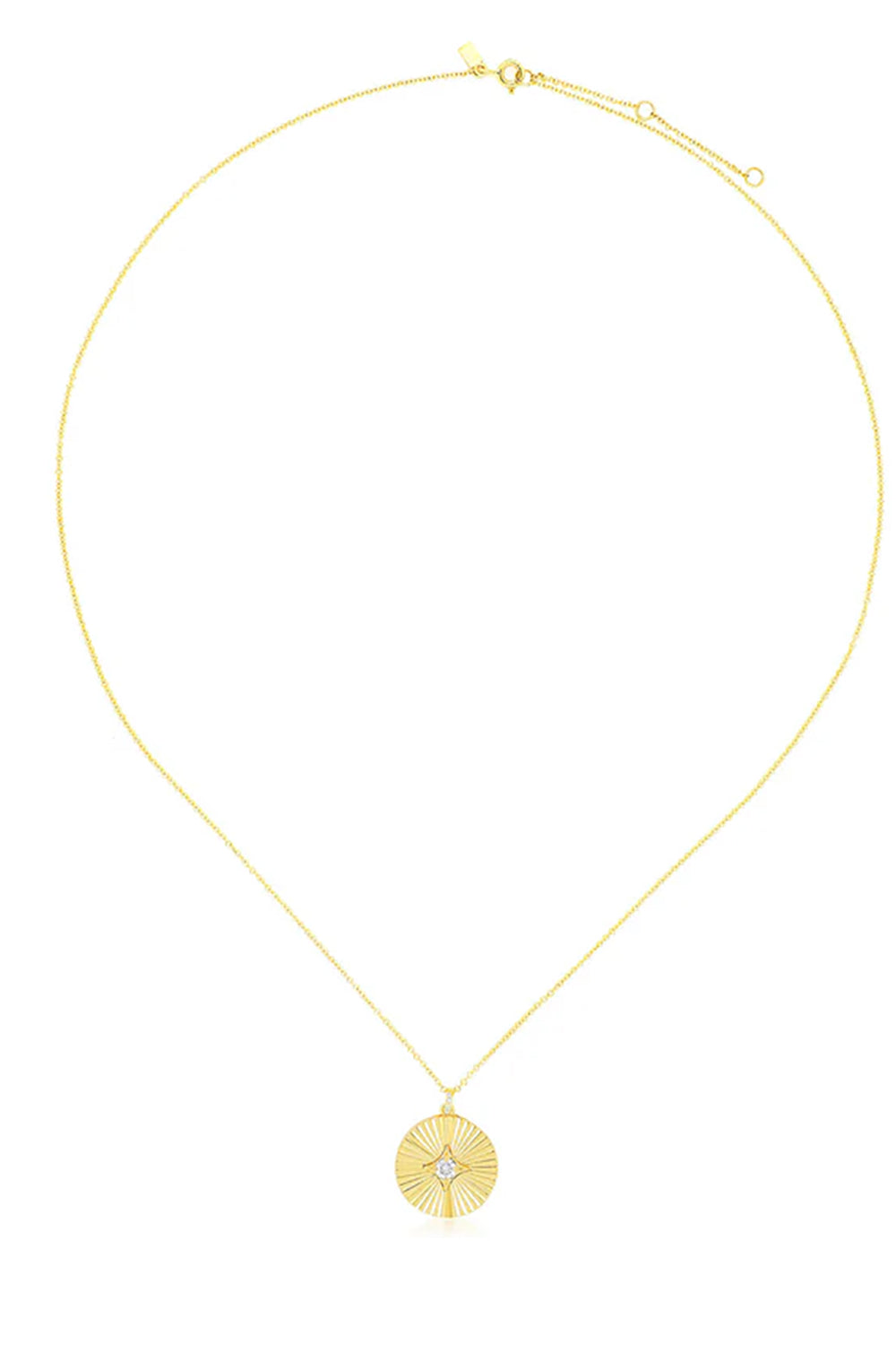 The Gold & Diamond Fluted Disc Necklace is a true charmer. With a central diamond set inside a gold sparkle design, this circular pendant features fluted lines that beautifully reflect light for added dimension and depth. Finished with a diamond-encrusted bail, this necklace is all about sparkle.