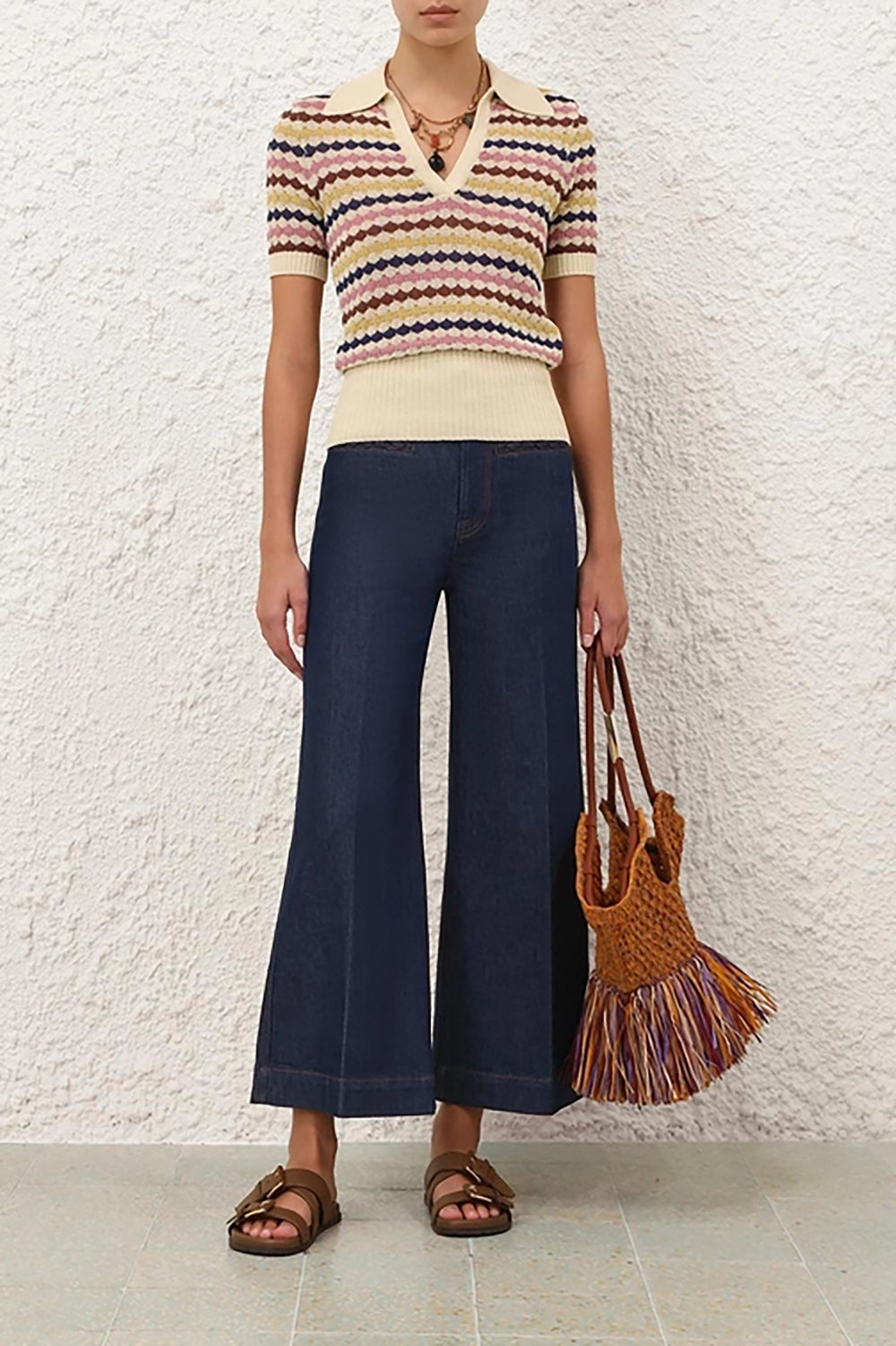 The Awaken Scallop Knit Polo from Zimmermann is a playful knit top with a colorful multi stripe print. This top features a classic collar, deep V-neckline, short sleeves, and elongated ribbed hem. Style with the coordinating midi skirt from Zimmermann and sandals. Model is 5'9.5" wearing size 0.