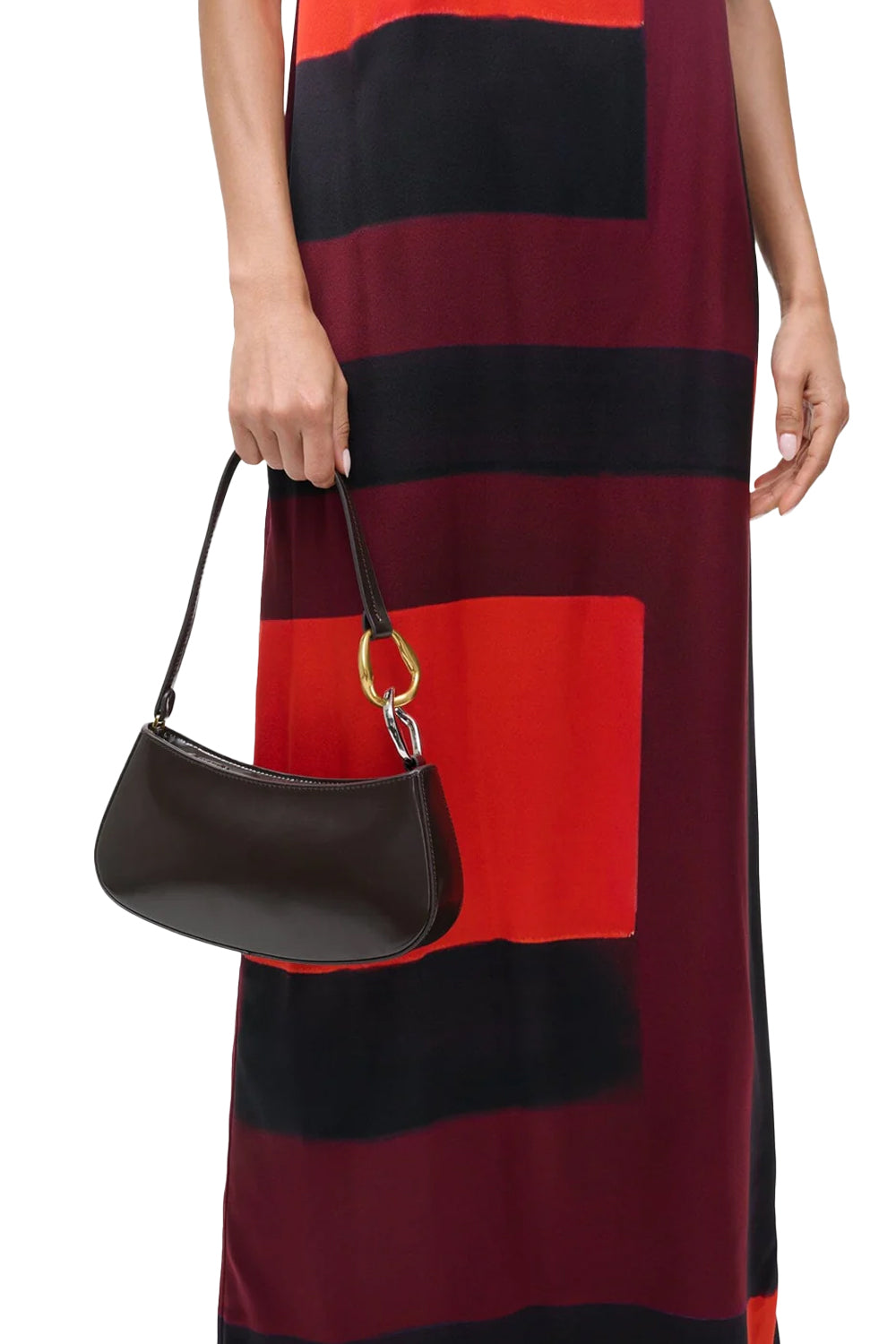 The Ollie Bag is a mini shoulder bag made out of polished leather. This style features a hardware design on the strap and a zip closure.