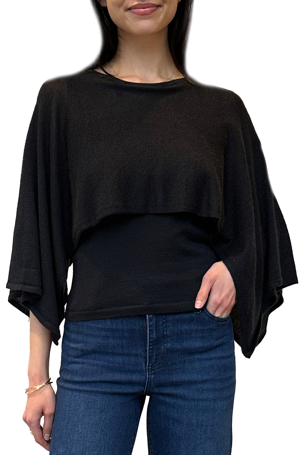 The Layered Caplet Top from Autumn Cashmere is an effortless, feminine style crafted from ultra-lightweight cashmere with a hint of metallic threading throughout. This unique style features a fitted underlayer and an airy and effortless caplet layer on the top. Pair with dark or black denim and heels.