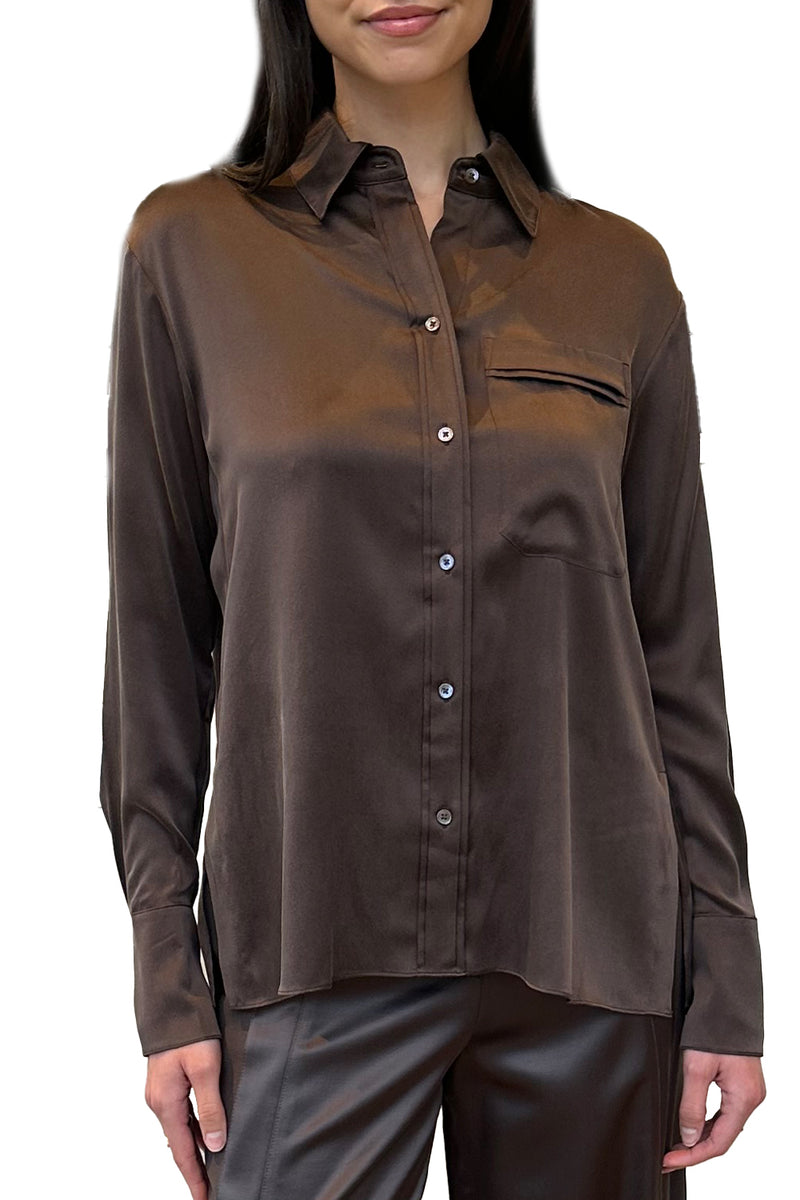 Taite Pant in Shiny Viscose Wool Satin in Chocolate Torte