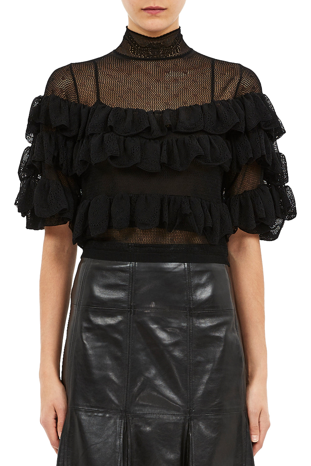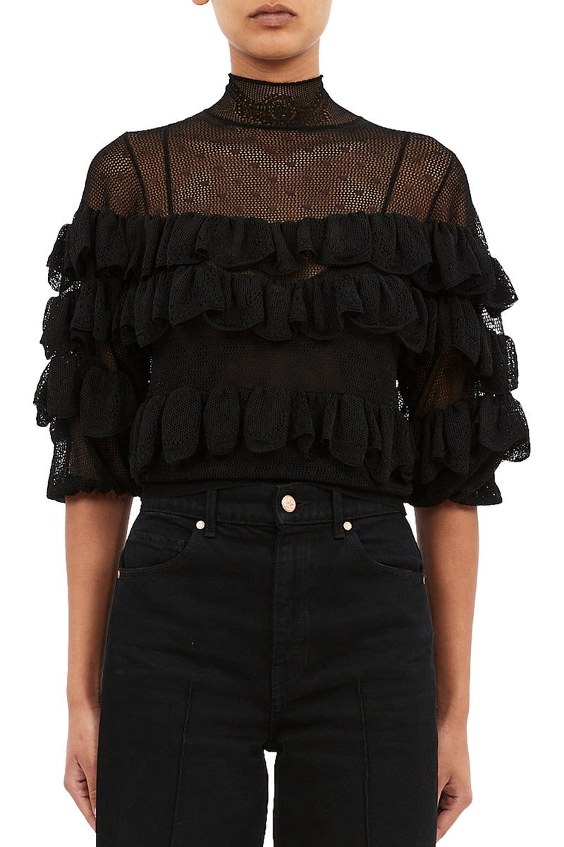 Corinna Mock Neck Tiered Ruffle Top in Noir