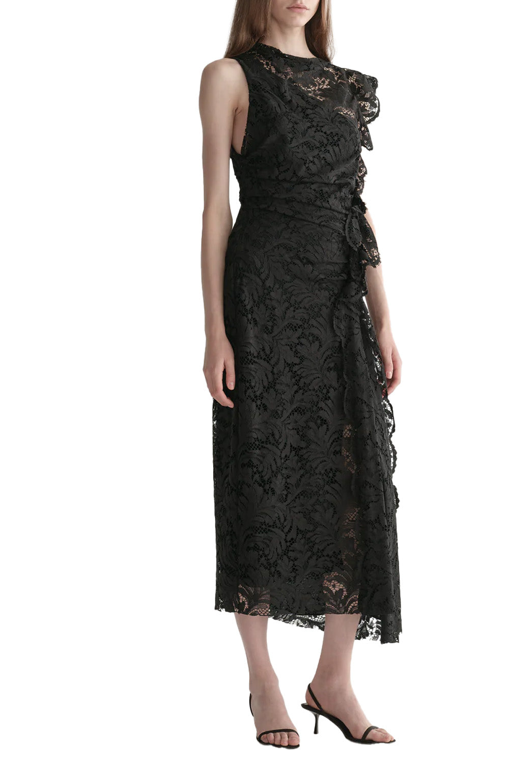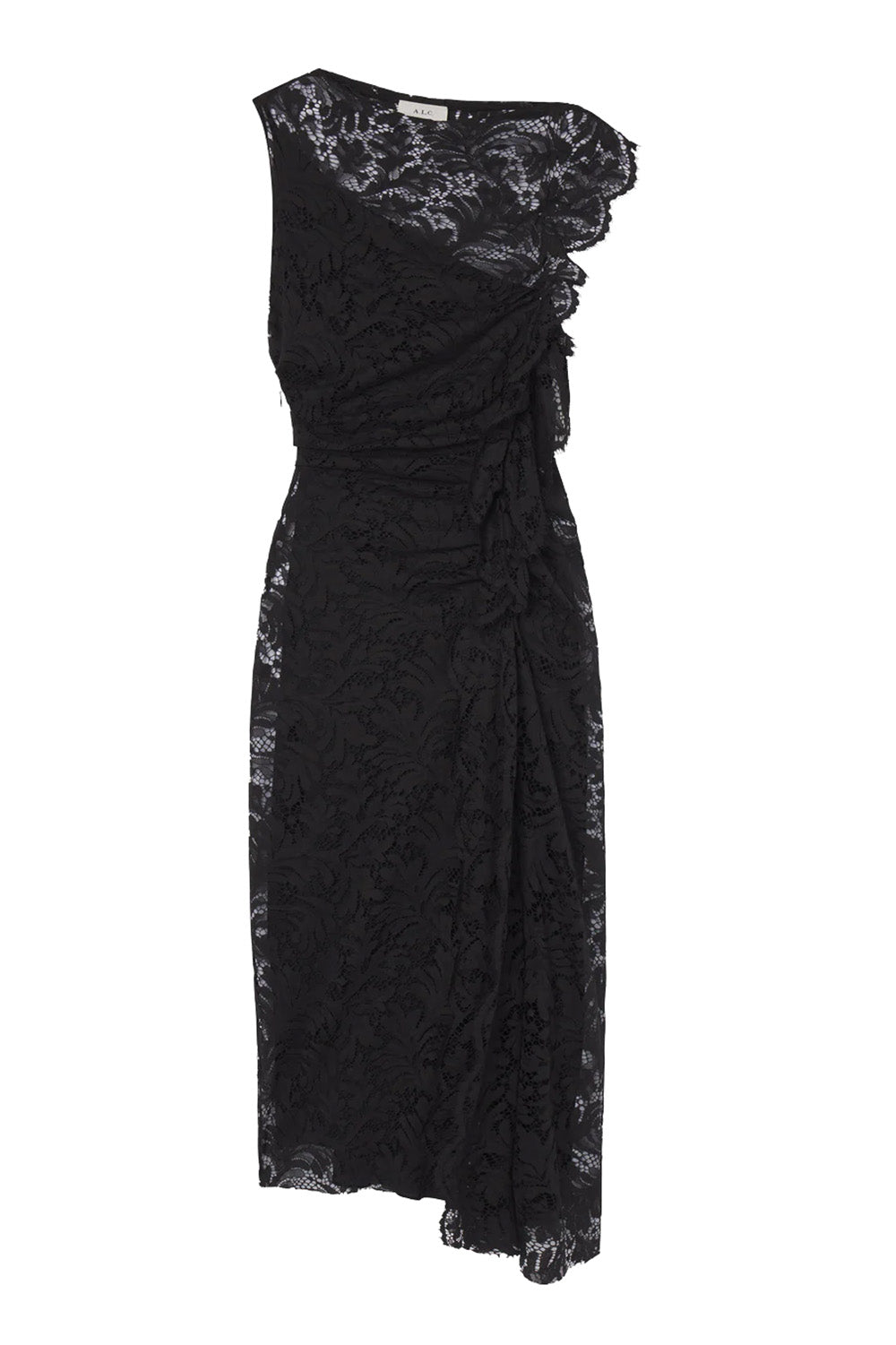 The Astrid Dress from ALC is a showstopping, feminine style that will stand the test of time. Crafted from archival French lace with a botanical-inspired pattern, this one-shoulder dress features a thigh-high slit, ruffled scalloped edging, a tonal lining, and a hidden side zip. Model is 5'9.5" wearing size 2.