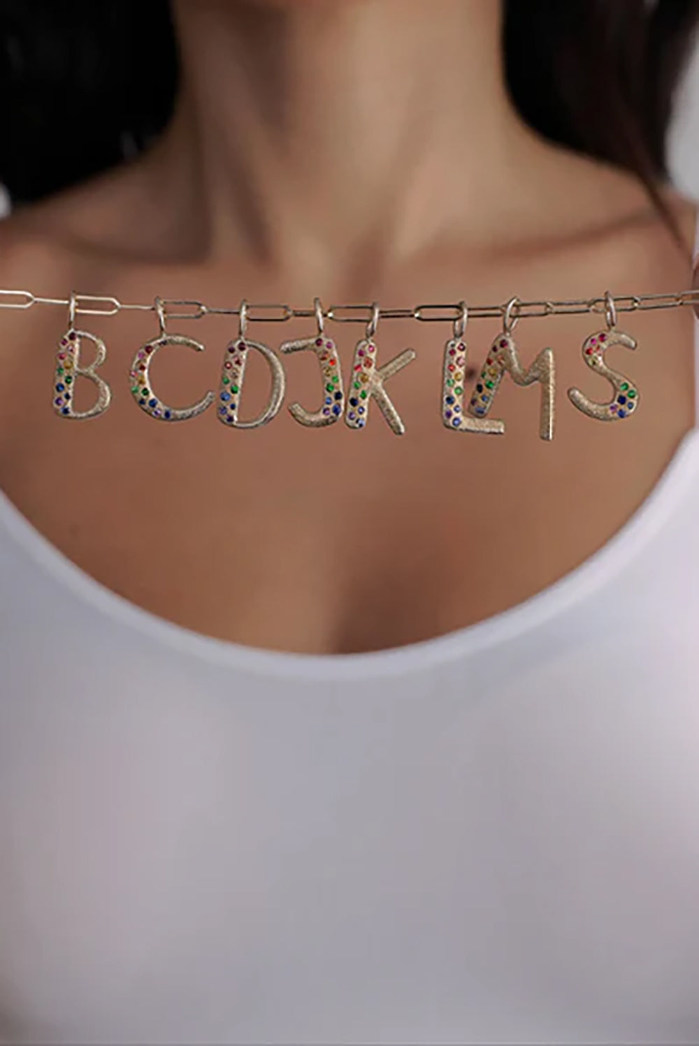 14k gold hand-drawn puffy letter measures 17mm in length. Set with rainbow color sapphires. Signature luster finish applied by hand.