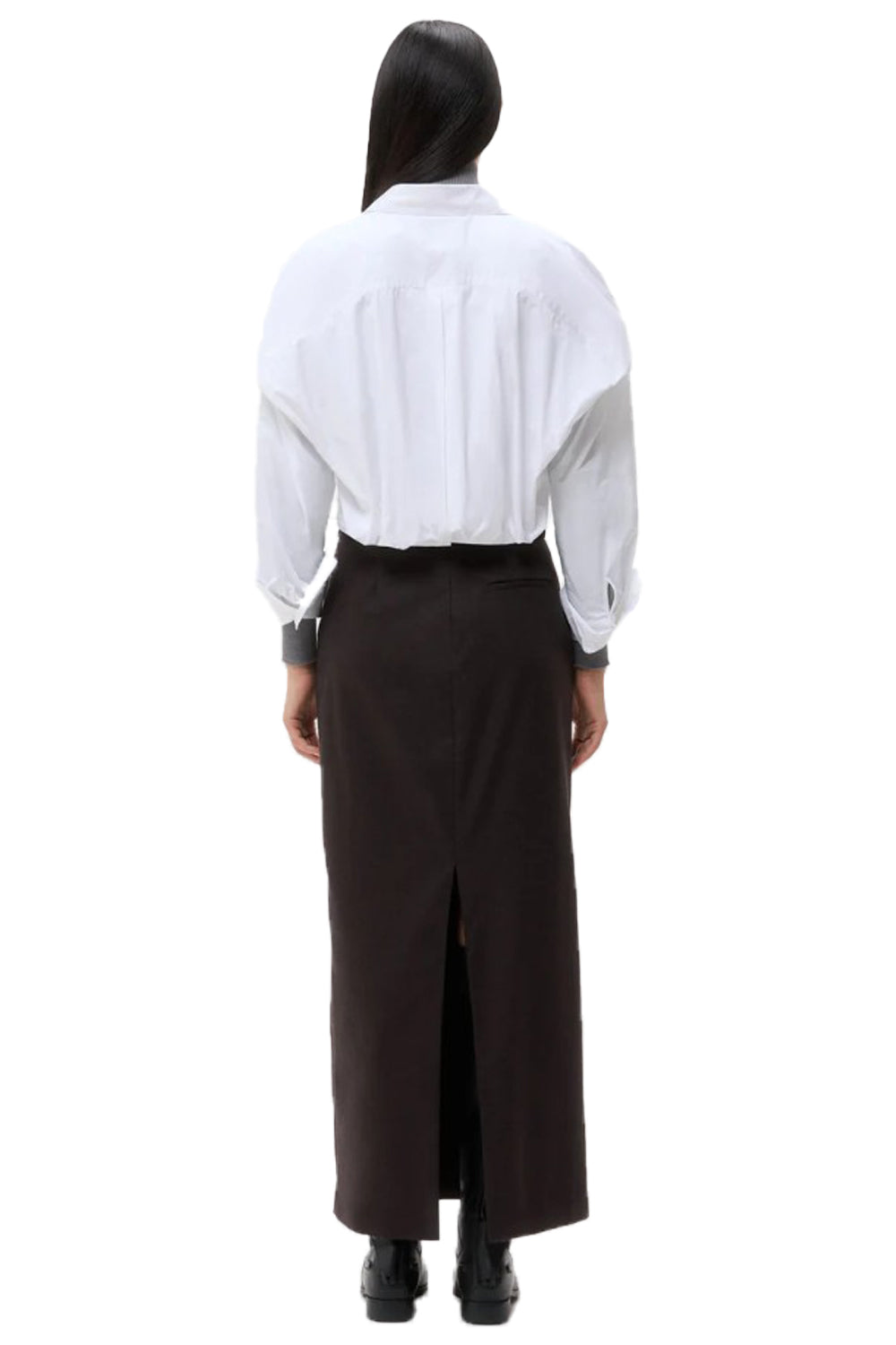The Take Top by TWP is an oversized, cropped button-down shirt featuring a refined, yet relaxed fit, center box pleat at the back, exposed button placket, chest patch pocket, spread collar, and single-roll button cuffs. Style with high-waisted trousers and chic booties.
