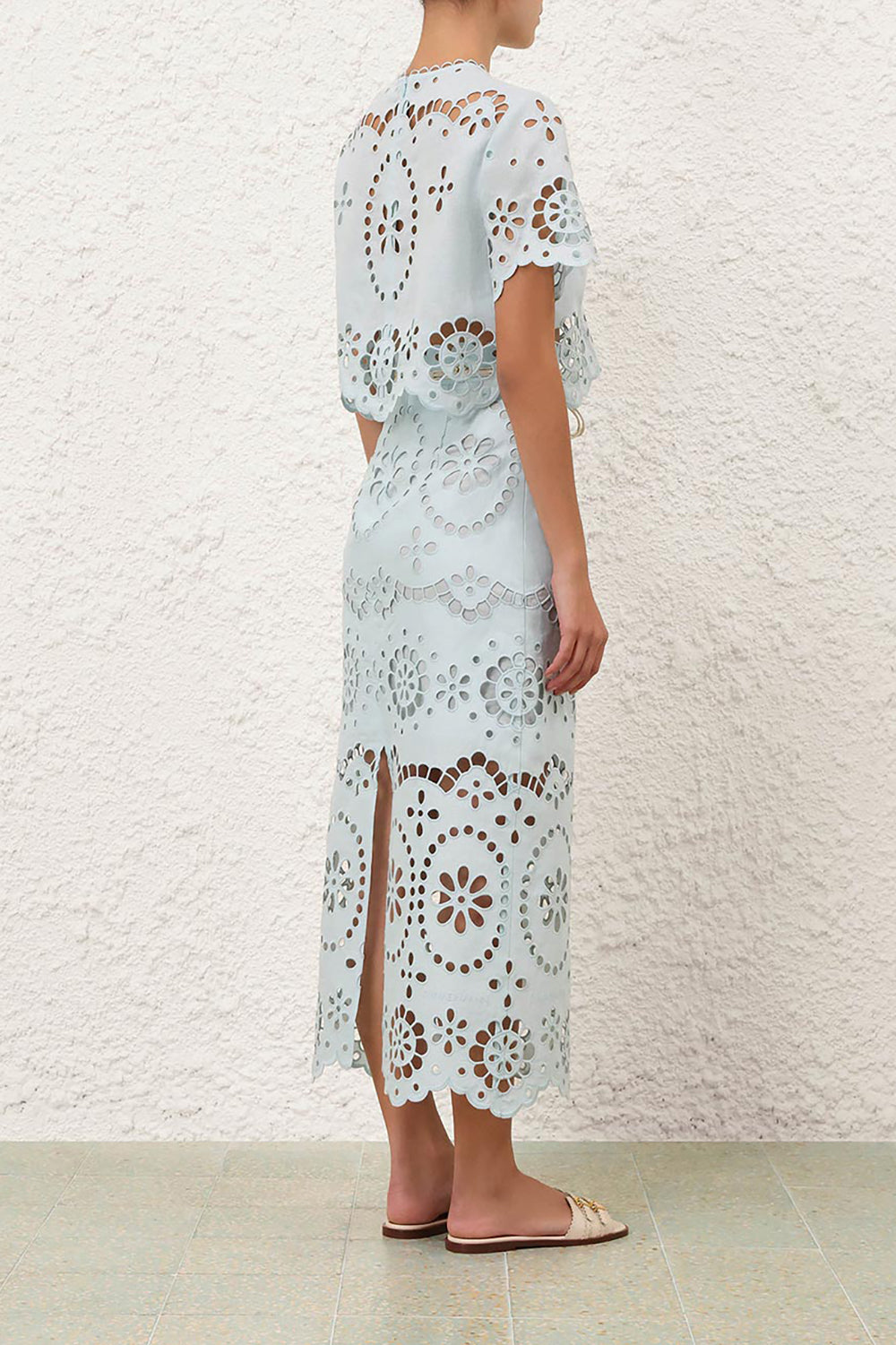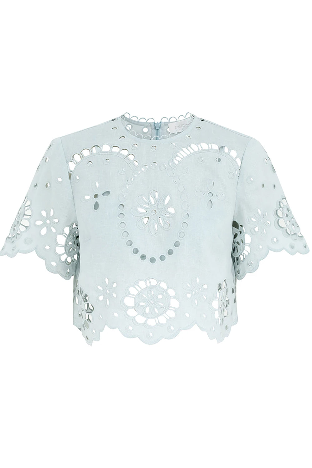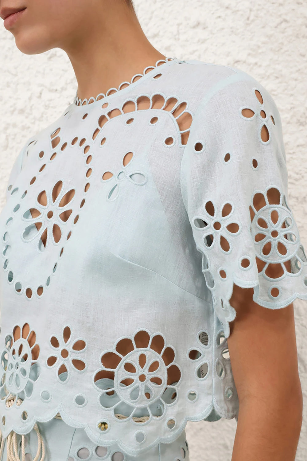 The Awaken Embroidered Bodice in Mint is a fresh linen top from Zimmermann's Resort Swim Collection. This beautifully detailed top features a cropped fit, scalloped finishes, an embroidered pattern throughout, an invisible back zip, and a delicate tonal bralette. Pair with the coordinating Awaken Embroidered Skirt and sandals. Model is 5'9.5" wearing size 0.