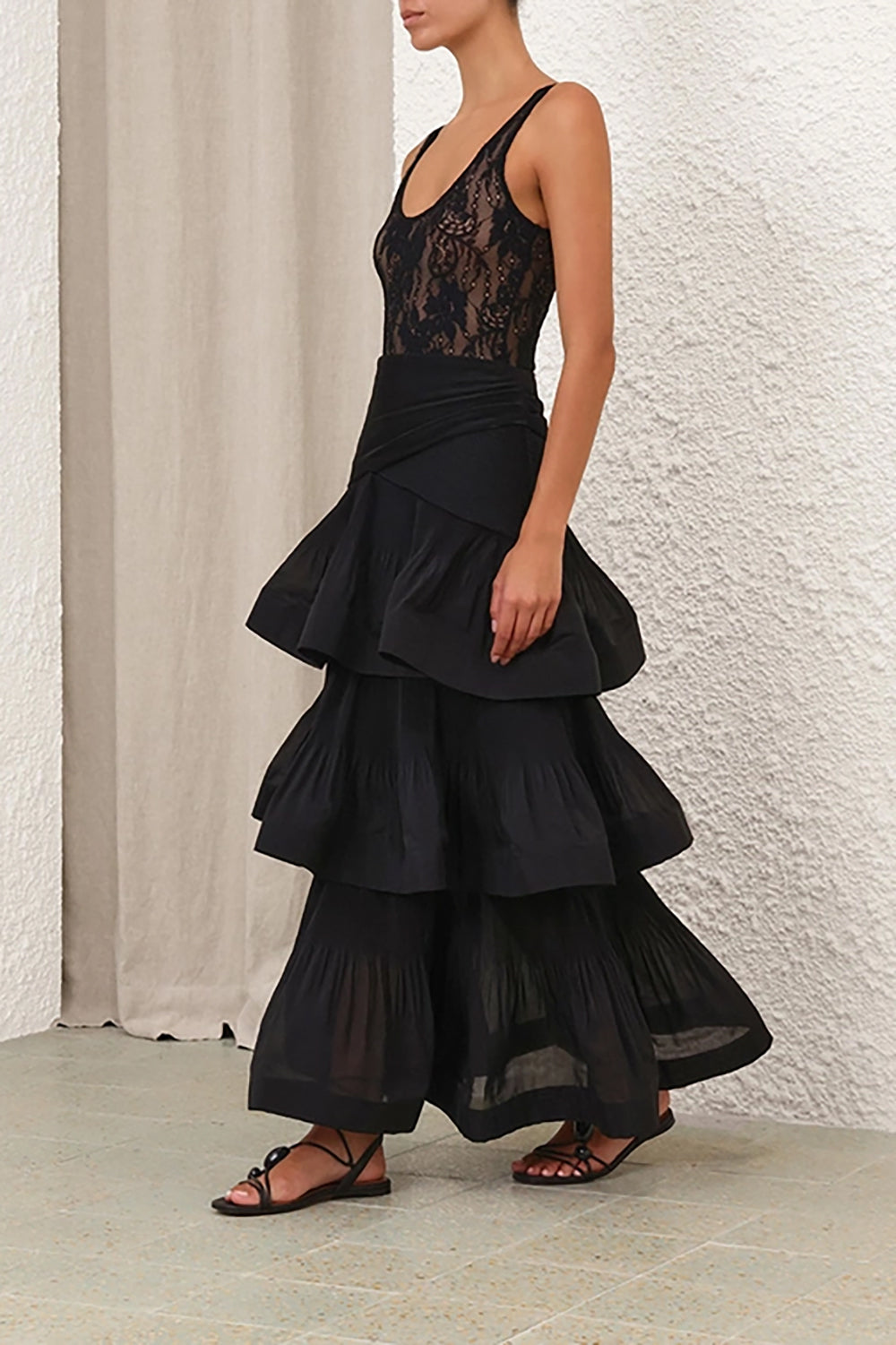 Rhiannon Ruffle Maxi Skirt in Black Paisley