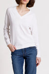 The bestselling Cotton Cashmere Frayed Edge V from Minnie Rose is back in classic white. This slimfitting style is crafted from a luxe super soft cotton cashmere blend and features a V neckline with frayed edges, and ribbed accents.