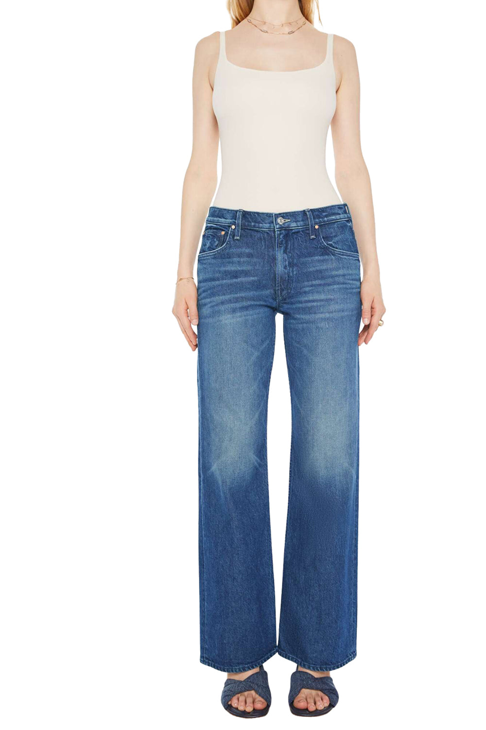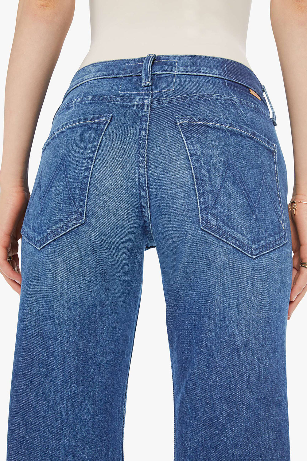 The Bookie Skimp is a semi-rigid boot cut jean from Mother featuring a looser leg, full length 31” inseam with a clean hem, zip fly, and high rise. Featuring a medium blue wash with whiskering and fading at the knees, these jeans have a timeless and seasonless feel that you’ll fall in love with. Model is 5' 9 1/2" wearing size 26.