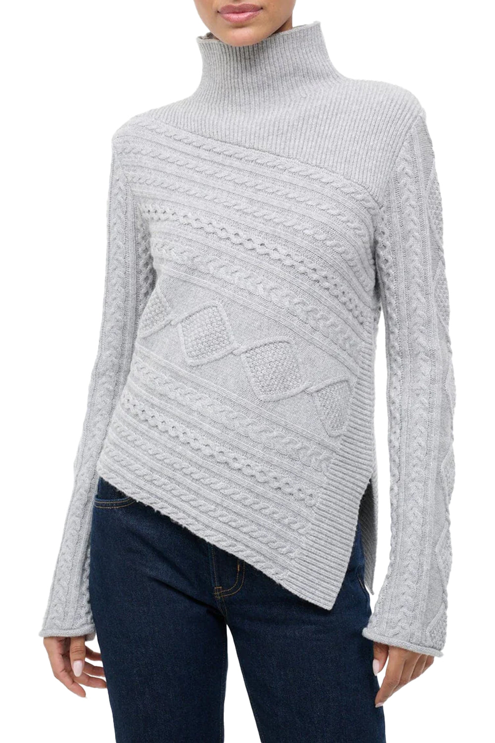 A modern turtleneck from Staud. The Sidney Sweater is crafted from a stretch wool blend and features a feminine fit, asymmetrical hem, and diagonal knit pattern. Style with straight leg jeans, boots, and your favorite outerwear. Model is 5’10” wearing size small.