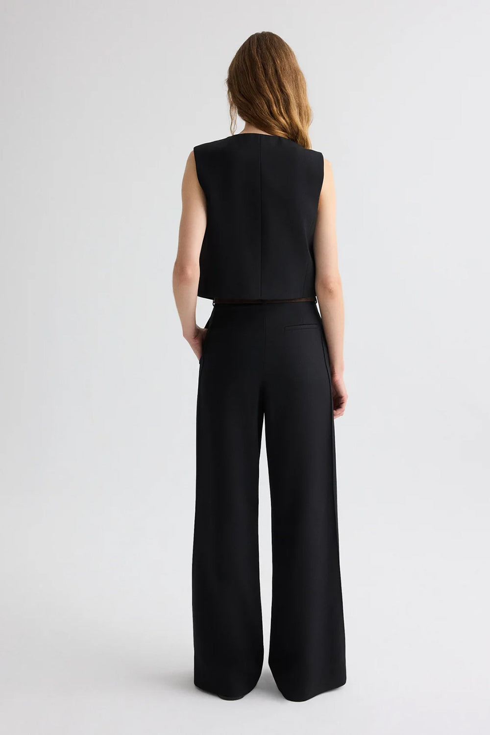 The high rise Bond St. Pant from TWP is a luxe, timeless pant crafted from 100% compact tux suiting wool. This wide leg pant features stunning front pleats, a beautiful draped shape, belt loops, side and back pockets, and a concealed zip and hook closure. This pant is designed to sit slightly lower on the waist than shown and does run large. We suggest sizing down. Model is 5’10” wearing size 2.