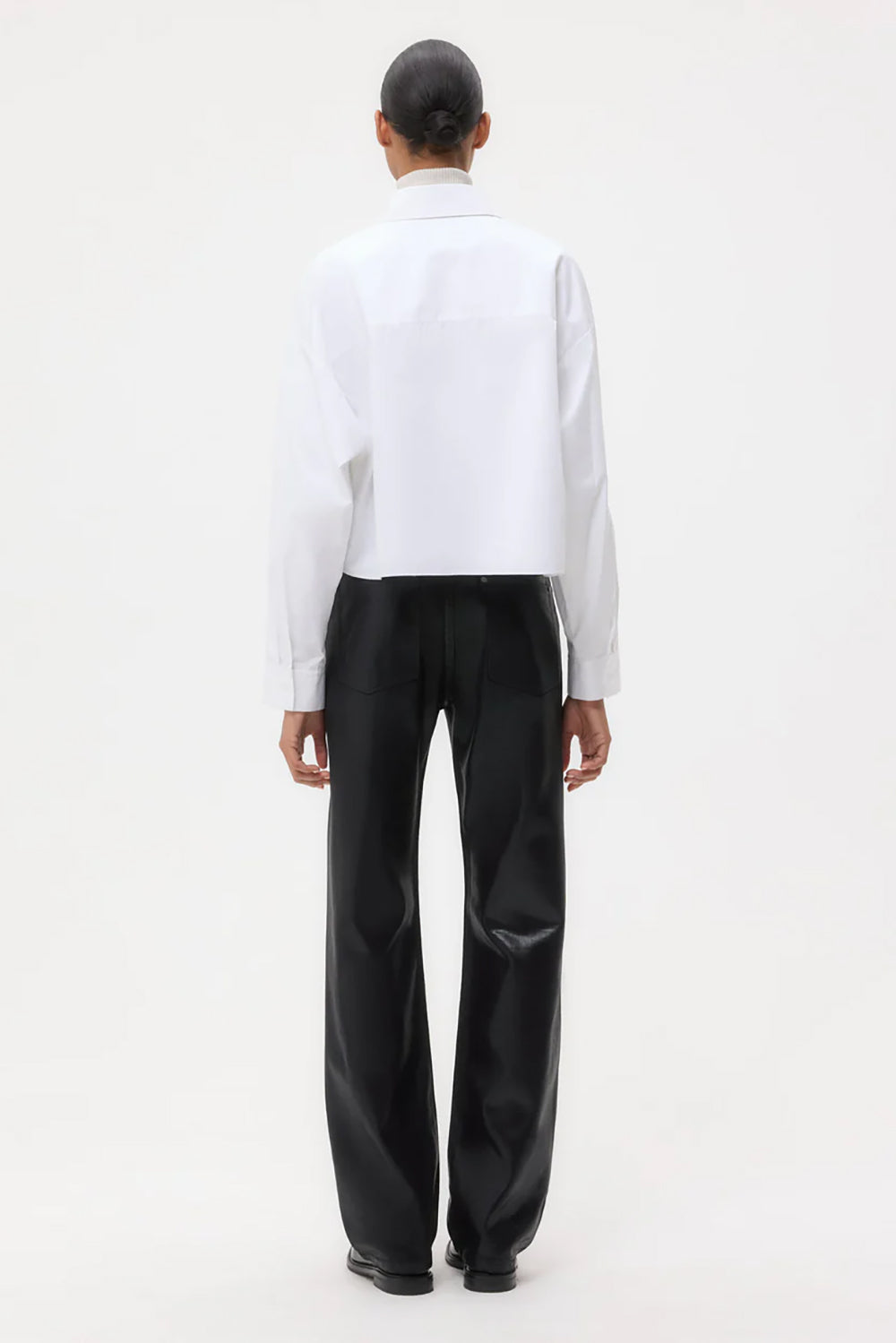 The Soon To Be Ex Shirt from TWP is updated with a tuxedo-style bib. This cotton poplin shirt features a boxy fit, an exposed button-up placket, chest patch pocket, and single-pick up button cuffs. Model is 5’10” wearing size extra small/small.