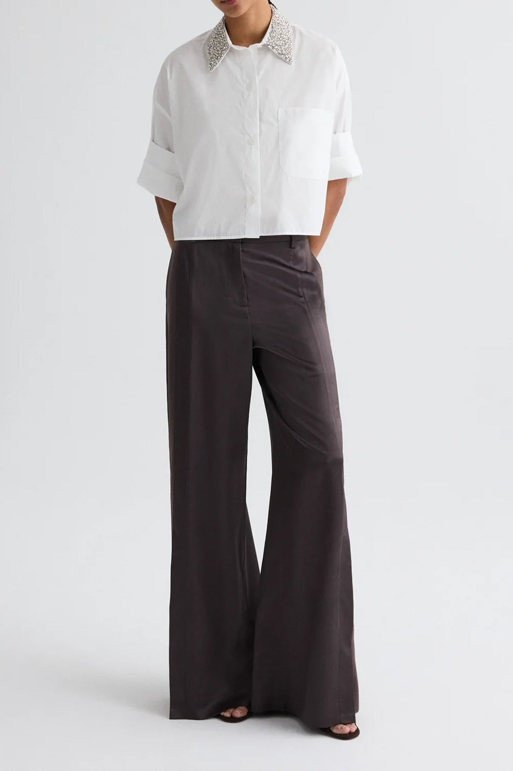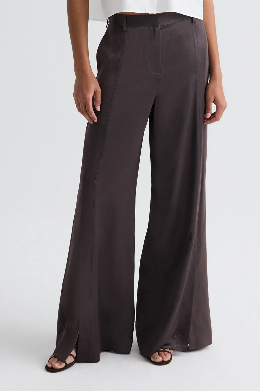 Taite Pant in Shiny Viscose Wool Satin in Chocolate Torte